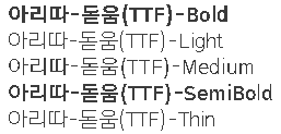 예를 들면 아리따돋움체처럼 Thin 부터 Bold까지 있는 폰트로 제목, 소제목, 본문에 맞춰 폰트를 설정한다.