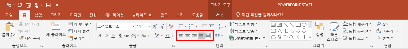 왼쪽맞춤, 오른쪽맞춤, 중앙맞춤, 양쪽맞춤은 위 사진의 빨간 네모칸에서 필요한 걸 선택해서 설정해주면 된다.