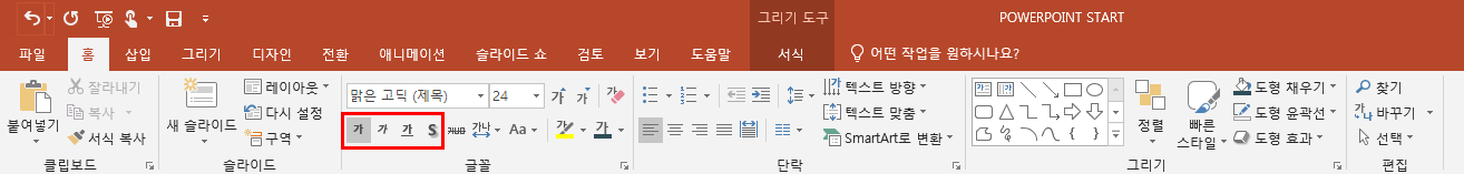 폰트의 굵기, 기울기, 밑줄, 그림자 표현은 위의 빨간 네모칸에서 설정할 수 있다.