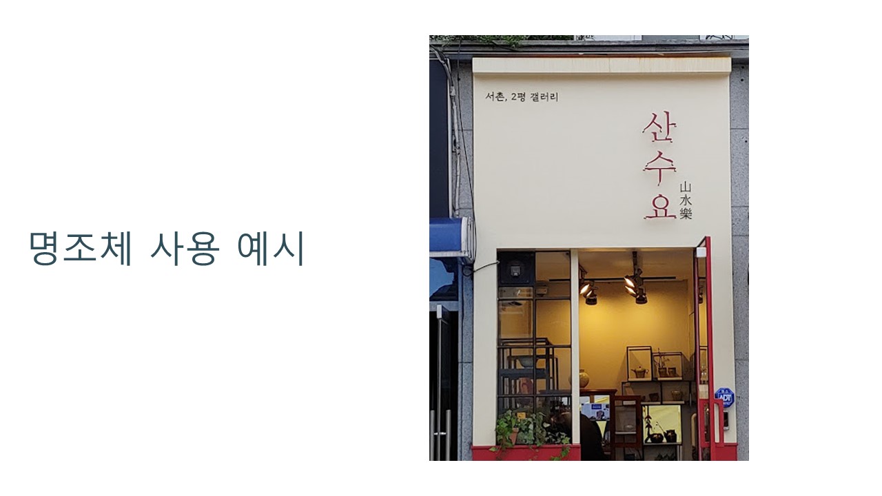 명조체를 활용한 가게는 서촌에 있는 갤러리인데 명조체를 사용했기 때문에 갤러리라는 예술적 특성과 더 어울리게 표현 되었다고 생각된다.