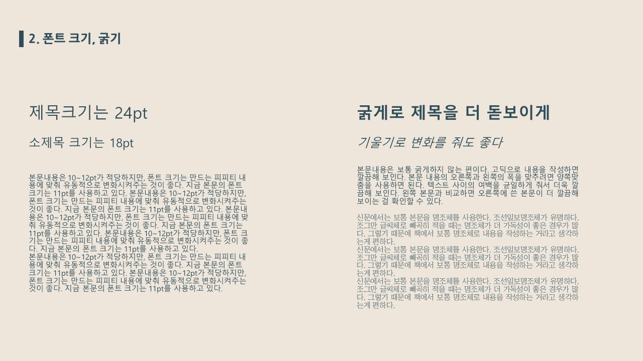 폰트의 종류만 중요한 것이 아니다. 크기에 따라 제목과 소제목 그리고 본문을 나눌 수 있고, 굵기와 기울기 그리고 밑줄 표현으로 강조를 할 수 있다.