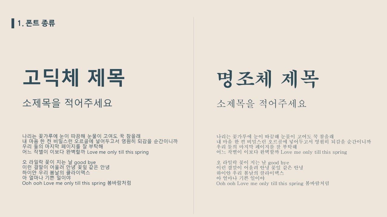 본인이 피피티를 만들 때 깔끔하게 표현해야 한다면 고딕체 종류의 폰트로 표현하고, 어딘가 감성적인 표현을 하고 싶다면 명조체 종류의 폰트를 사용하면 된다.