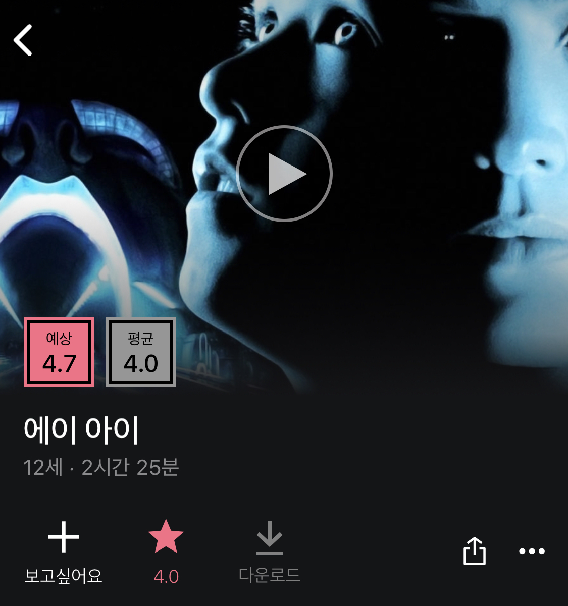 세번째는 스티븐 스필버그 감독의 a.i 에이아이 입니다. 왓챠 회원들이 가장 보고싶어하는 상위 1%작품이기도 하네요. 이 영화는 제가 티비에서 우연히 봤는데 전 원래 잔잔한 영화는 별로 좋아하지 않는데, 이 영화는 잔잔해도 몰입하면서 봤어요.