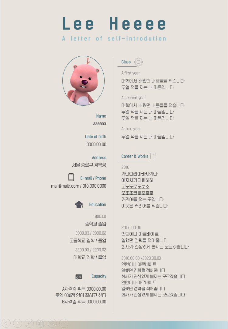 예시로 내가 전에 피피티로 만든 이력서를 보여주자면 아래처럼 만들었다.