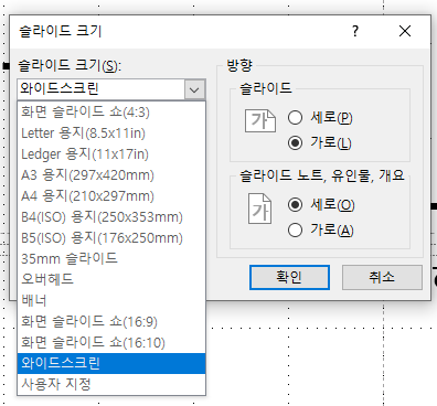 위와 같이 슬라이드 크기를 다양하게 조절할 수 있다. 보통 회사에서 기획서를 작성할 때는 A4용지 크기로 가로 방향으로 만들면 인쇄했을 때 크기에 맞춰서 인쇄되어 깔끔하게 보인다.