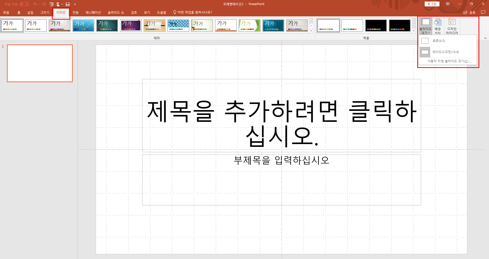 상단 메뉴에서 [디자인]을 클릭하고 오른쪽에 나오는 [슬라이드 크기]라는 걸 클릭하면 기본적으로 표준 4:3 과 와이드 스크린 16:9가 나온다. 나는 표준 크기는 거의 사용하지 않는다. 활용할 소지도 별로 없고 무엇보다 4:3으로 할 경우 어딘가 초보가 만든 피피티 느낌이 난다. 그러니 웬만하면 와이드스크린이나 A4용지 크기로 맞춰서 제작하길 바란다.